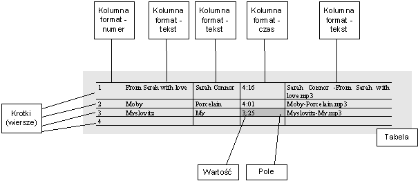Przecięcie wiersza z kolumną w tabeli może mieć tylko jedną wartość. Może to być wartość pusta (brak wartości) – NULL. Każda tabela ma klucz główny, czyli kolumnę jednoznacznie identyfikującą element tabeli (wiersz, krotkę). W powyższym przykładzie jest to numer po lewej stronie. Klucz główny nie może mieć wartości NULL. Klucz główny należy zawsze wyznaczać bardzo ostrożnie. W powyższym przykładzie nie może to być tytuł piosenki (może się powtórzyć), nie może być to wykonawca, nazwa pliku również może się powtórzyć w dwóch różnych katalogach (ale pełna ścieżka do pliku mogłaby być). Zawsze uniwersalnym rozwiązaniem jest wprowadzenie kolumny, która zawiera kolejne numery elementów. Jest to stosowane na przykład w bibliotekach, gdzie każda książka ma swój numer – niezależnie od tego czy baza biblioteki znajduje się na papierze (w kartotece) czy w komputerze.